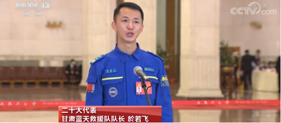 二十大代表、甘肃蓝天救援队队长於若飞:我们是一支志愿服务的队伍,在我们的队伍里绝大多数人都有着自己的本职工作。但因为我们有共同的理想信念,所以每次有灾害发生的时候,我们都会聚集在一起来贡献我们的力量。在过去的10年里,我和我的队员参加了四川雅安地震、云南鲁甸地震、尼泊尔地震等国内外救援行动,参与挽救幸存者81人,救治600余人。在这些救援经历当中让我最难忘的是在一次地震救援中,有一位遇难者被压在横梁下面,需要有人爬进去将他转移出来,但是由于现场余震不断,年轻的救援队员心里多少都是有一些害怕的,我也有犹豫,但是因为我是共产党员,必须得站出来,所以我爬进了废墟。当我完成任务从废墟里面爬出来的时候,我发现周围的人都在为我鼓掌。那一刻,我感受到作为一名共产党员的自豪,同时也深刻意识到党员的责任就是即使面临生命危险也要勇敢无惧,冲锋在前。
