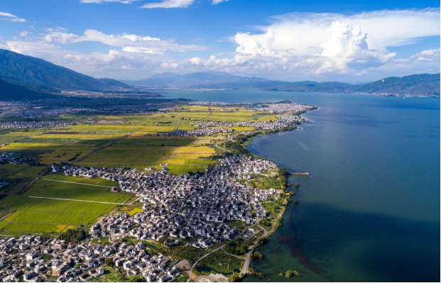 这是2022年9月27日拍摄的云南大理洱海及村落景观(无人机照片)。新华社记者 陈欣波 摄